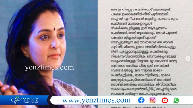 പോലീസിലും നിമയവിശ്വാസത്തിലും സമൂഹത്തിനുള്ള വിശ്വാസം ദൃഢമാകാൻ നീതി പൂർണമാകേണ്ടതുണ്ടെന്ന് മഞ്ജു പറയുന്നു. ഈ നാട്ടിലെ ഓരോ പെൺകുട്ടിക്കും ഓരോ സ്ത്രീക്കും ഓരോ മനുഷ്യർക്കും തൊഴിലിടങ്ങളിലും തെരുവിലും ജീവിതത്തിലും തലയുർത്തിപ്പിടിച്ച് ഭയപ്പാടില്ലാതെ നടക്കാൻ കഴിയുന്ന സാഹചര്യമുണ്ടാകണമെന്ന് മഞ്ജു വാര്യർ ഇൻസ്റ്റാഗ്രാമിൽ പങ്കുവെച്ച പോസ്റ്റിൽ പറയുന്നു. അന്നും, ഇന്നും, എന്നും അവൾക്കൊപ്പം എന്ന് പറഞ്ഞാണ് പോസ്റ്റ് അവസാനിപ്പിക്കുന്നത്. കേസിൽ അതിജീവിതയുടെ പ്രതികരണം വന്നതിന് പിന്നാലെയാണ് മഞ്ജു വാര്യരുടെയും പ്രതികരണം എത്തുന്നത്.