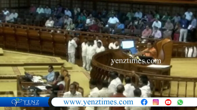 രാഹുല് ഗാന്ധിക്കെതിരായ ബിജെപി നേതാവിന്റെ ഭീഷണിയില് പ്രതിപക്ഷം നല്കിയ അടിയന്തര പ്രമേയ നോട്ടീസ് സ്പീക്കര് തള്ളി. പ്രമേയം ചര്ച്ചയ്ക്കെടുക്കാത്തതില് പ്രതിപക്ഷം സഭയ്ക്കകത്തും പുറത്തും വ്യാപക പ്രതിഷേധമുയര്ത്തി. നടുത്തളത്തില് ബാനറുമായി പ്രതിപക്ഷം പ്രതിഷേധിച്ചു. ടി സിദ്ദിഖ് എംഎല്എ സ്പീക്കറുടെ ഡയസിലേക്കെത്തുന്ന സാഹചര്യമുണ്ടായി. സ്പീക്കര് നീതി പാലിക്കുക എന്ന ബാനറുയര്ത്തിയായിരുന്നു നടുത്തളത്തില് പ്രതിപക്ഷത്തിന്റെ പ്രതിഷേധം.