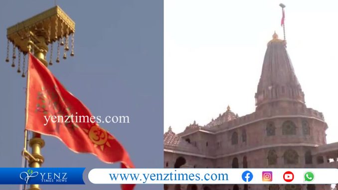ക്ഷേത്രത്തിന്റെ ശിഖിരത്തില് 191 അടി ഉയരത്തിലാണ് പതാക സ്ഥാപിച്ചത്. 10 അടി ഉയരവും 22 അടി നീളവുമുള്ളതുമാണ് പതാക. ഗുജറാത്തിലെ അഹമ്മദാബാദിൽ നിന്നാണ് പതാക നിര്മിച്ചിട്ടുള്ളത്. ഭഗവാൻ ശ്രീരാമന്റെ ആര്ശങ്ങളുടെ സൂചകമായി കോവിദാര വൃക്ഷത്തിന്റെ ചിത്രം ഇതില് ഉള്പ്പെടുത്തിയിട്ടുണ്ട്. അതോടൊപ്പം ഓം എന്നും ഇതില് ആലേഖനം ചെയ്തിട്ടുണ്ട്. രാമരാജ്യത്തിന്റെ ആദർശങ്ങൾ ഉൾക്കൊള്ളുന്ന പതാക അന്തസിന്റെയും ഐക്യത്തിന്റെയും സാംസ്കാരിക തുടർച്ചയുടെയും സന്ദേശം നൽകുമെന്നാണ് അധികൃതര് പറയുന്നത്.