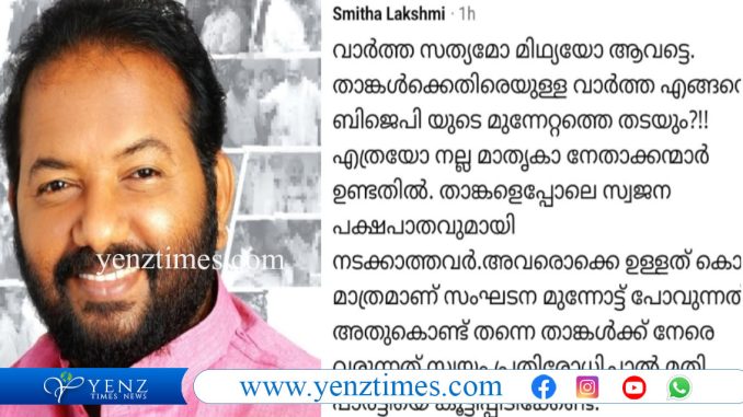 തനിക്കെതിരെയുള്ള വാർത്ത ബിജെപി മുന്നേറ്റം ഭയനെന്ന് എസ് സുരേഷിന്റെ ഫേസ്ബുക്ക് പോസ്റ്റ്; സ്വയം പ്രതിരോധിച്ചാൽ മതി, പാർട്ടിയെ കൂട്ടിപ്പിടിക്കേണ്ടെന്ന് മഹിളാമോർച്ച നേതാവ്