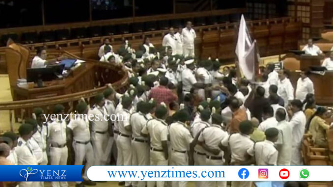 അയ്യപ്പന്റെ സ്വർണ്ണം ചെമ്പാക്കിയ കൊള്ള സംഘം, അയ്യപ്പന്റെ സ്വർണം ചെമ്പാക്കിയ എൽഡിഎഫ് രാസവിദ്യ എന്നെഴുതിയ ബാനറുകൾ ഉയർത്തിയാണ് പ്രതിപക്ഷ പ്രതിഷേധം. വാച്ച് ആൻഡ് വാർഡിനെ ഇറക്കി പ്രതിപക്ഷ അംഗങ്ങളെ തടഞ്ഞു. ഫ്ലോറിൽ ബാനർ പിടിക്കാൻ കഴിയില്ലെന്ന് സ്പീക്കർ പറഞ്ഞു. ബാനർ പിടിച്ചു വാങ്ങിക്കാൻ സ്പീക്കർ നിർദേശിച്ചു. പ്രതിപക്ഷ നേതാവ് മുഖ്യമന്ത്രിയെക്കുറിച്ച് പറഞ്ഞത് വസ്തുതയല്ലെന്ന് മന്ത്രി എംബി രാജേഷ് പറഞ്ഞു.