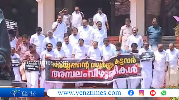 ചോദ്യോത്തരവേള ആരംഭിച്ച് സ്പീക്കര്‍ എ എന്‍ ഷംസീര്‍ ചെയറില്‍ എത്തിയ സമയത്ത് ശബരിമല സ്വര്‍ണപ്പാളി വിഷയം ഉന്നയിച്ച് പ്രതിഷേധവുമായി പ്രതിപക്ഷം നടുത്തളത്തിലിറങ്ങുകയായിരുന്നു. ഇതോടെ ചോദ്യോത്തരം റദ്ദ് ചെയ്ത് സഭ അല്‍പ്പസമയത്തേക്ക് നിര്‍ത്തിവെച്ചതായി സ്പീക്കര്‍ അറിയിച്ചു. തുടര്‍ച്ചയായ രണ്ടാം ദിവസമാണ് പ്രതിപക്ഷ ബഹളത്തെത്തുടര്‍ന്ന് സഭാ നടപടികള്‍ നിര്‍ത്തിവെയ്ക്കുന്നത്. ‘സ്വര്‍ണ്ണം കട്ടത് ദേവസ്വം ബോര്‍ഡിന്റെ അറിവോടെ’, ‘കൊള്ള സംഘം അയ്യപ്പ വിഗ്രഹവും അടിച്ചു മാറ്റും’ എന്നീ പ്ലക്കാര്‍ഡ് ഉയര്‍ത്തിയാണ് സഭയില്‍ പ്രതിപക്ഷം മുദ്രാവാക്യം വിളിച്ചത്. സ്പീക്കറിന്റെ മുഖം മറച്ചും പ്രതിപക്ഷം പ്രതിഷേധിച്ചു.