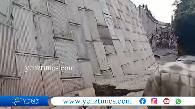 സംരക്ഷണഭിത്തി തകര്‍ന്നതോടെ സര്‍വീസൂം റോഡും ഇടിഞ്ഞു. അപകടസമയത്ത് സ്‌കൂള്‍ ബസ് ഉള്‍പ്പടെ നാലുവാഹനങ്ങള്‍ കുടുങ്ങി. ബസ്സിലുണ്ടായിരുന്ന കുട്ടികളെ സുരക്ഷിരായി മാറ്റി. ആര്‍ക്കും പരിക്കില്ല.